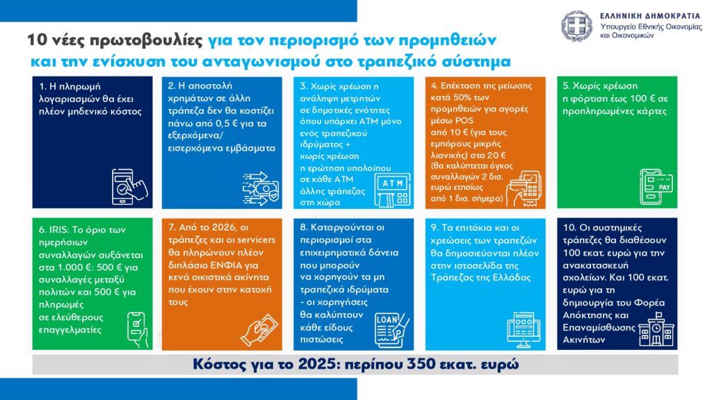 Κατάργηση προμηθειών για πληρωμές λογαριασμών, δραστική μείωση έως και 80% των προμηθειών μεταφοράς χρημάτων μεταξύ τραπεζών, διπλασιασμός του ΕΝΦΙΑ για κλειστά οικιστικά ακίνητα που διαθέτουν οι τράπεζες και οι servicers ώστε να διοχετευθούν στην αγορά και ευκολότερη πρόσβαση στον δανεισμό μέσω της εξάλειψης των περιορισμών στη χρηματοδότηση από τις Εταιρίες Παροχής Πιστώσεων, περιλαμβάνονται, μεταξύ άλλων, στις πρωτοβουλίες της Κυβέρνησης για τον περιορισμό των τραπεζικών προμηθειών και την ενίσχυση του ανταγωνισμού στον τραπεζικό κλάδο. Παράλληλα, οι τράπεζες προχωρούν οικειοθελώς στην διάθεση 100 εκατ. ευρώ για την ανακατασκευή σχολείων και 100 εκατ. ευρώ για την δημιουργία του Φορέα Απόκτησης και Επαναμίσθωσης Ακινήτων που στόχο έχει την προστασία των κατοικιών των ευάλωτων πολιτών. Το κόστος των παρεμβάσεων από την μείωση ή εξάλειψη των τραπεζικών προμηθειών ανέρχεται στα 150 εκατ. ευρώ κάθε έτος, ποσό που μεταφράζεται σε αντίστοιχη ανακούφιση των πολιτών. Η ψήφιση της διάταξης για τις μειώσεις στις τραπεζικές προμήθειες θα γίνει εντός Δεκεμβρίου και θα εφαρμοστεί σε ένα μήνα από την ψήφιση.