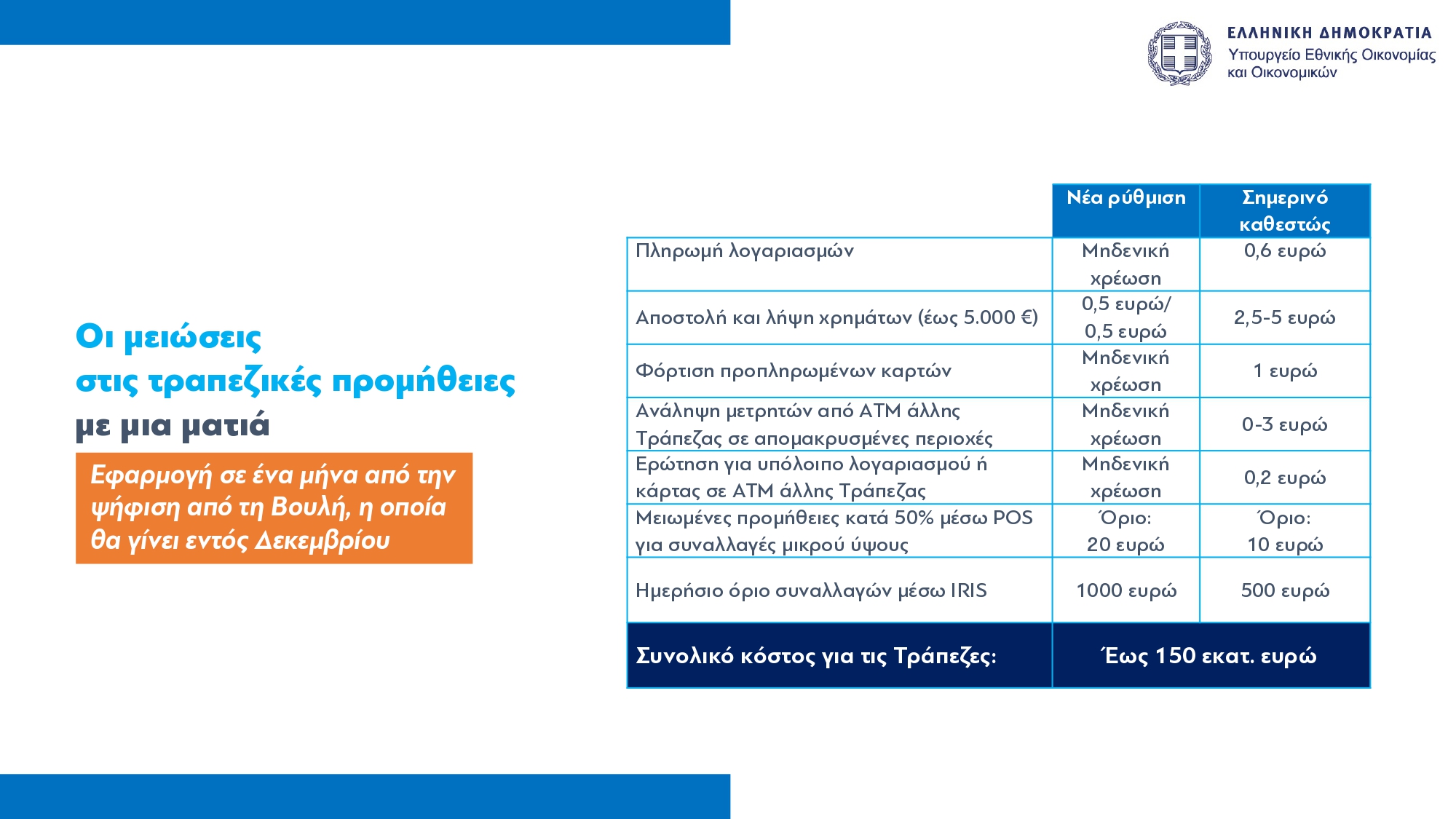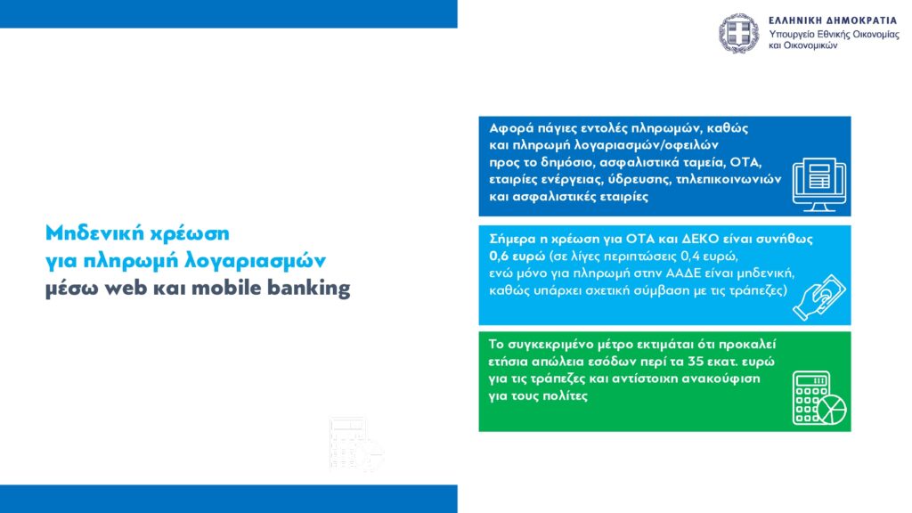 - Μηδενική χρέωση για πληρωμή λογαριασμών και οφειλών προς το δημόσιο, ασφαλιστικά ταμεία, ΟΤΑ, εταιρίες ενέργειας, ύδρευσης, τηλεπικοινωνιών και ασφαλιστικές εταιρίες, μέσω web-banking και mobile-banking. Ενδεικτικά, σήμερα η χρέωση για πληρωμή λογαριασμών ΔΕΚΟ ή ΟΤΑ είναι συνήθως 0,6 ευρώ ανά συναλλαγή. Το συγκεκριμένο μέτρο εκτιμάται ότι προκαλεί ετήσια απώλεια εσόδων περί τα 35 εκατ. ευρώ για τις τράπεζες κάτι που μεταφράζεται σε αντίστοιχη ανακούφιση για τους πολίτες.