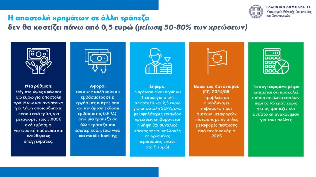 - Μείωση 50% έως 80% των χρεώσεων για αποστολή χρημάτων σε άλλη τράπεζα. Συγκεκριμένα καθιερώνεται μέγιστο ύψος χρέωσης 0,5 ευρώ για αποστολή χρημάτων (εξερχόμενο έμβασμα) και 0,5 ευρώ για λήψη χρημάτων (εισερχόμενο έμβασμα), για ποσά έως 5.000€ ανά έμβασμα, για φυσικά πρόσωπα και ελεύθερους επαγγελματίες, μεταξύ τραπεζών. Αφορά τόσο απλά εμβάσματα, όσο και άμεσες μεταφορές πίστωσης (SEPA). Αυτό αντιστοιχεί σε μείωση του κόστους για τις εν λόγω προμήθειες από 50% έως και 80% αναλόγως την τράπεζα και το είδος εμβάσματος (από 1 έως 2,5 ευρώ που κοστίζει σήμερα). Το συγκεκριμένο μέτρο εκτιμάται ότι προκαλεί ετήσια απώλεια εσόδων περί τα 95 εκατ. ευρώ για τις τράπεζες κάτι που μεταφράζεται σε αντίστοιχη ανακούφιση για τους πολίτες. Επιπλέον, από τις αρχές του νέου έτους, βάσει του κανονισμού 2024/88, προβλέπεται η ισοδύναμη επιβάρυνση των άμεσων μεταφορών πίστωσης με τις απλές μεταφορές πίστωσης.