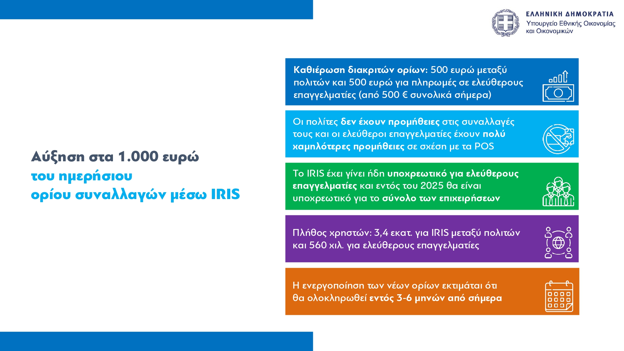 - Διευρύνεται η χρήση του συστήματος άμεσων πληρωμών IRIS καθώς αυξάνεται το όριο των ημερήσιων συναλλαγών στα 1.000 ευρώ από 500 ευρώ που είναι σήμερα. Συγκεκριμένα, καθιερώνονται διακριτά όρια ημερήσιων συναλλαγών: 500 ευρώ μεταξύ πολιτών και 500 ευρώ για πληρωμές σε ελεύθερους επαγγελματίες. Υπενθυμίζεται πως οι πολίτες δεν πληρώνουν καμία προμήθεια για τις μεταξύ τους συναλλαγές, ενώ οι ελεύθεροι επαγγελματίες έχουν πολύ χαμηλότερες προμήθειες σε σχέση με τις αντίστοιχες που πληρώνουν αν η ίδια συναλλαγή γίνει μέσω POS. Τονίζεται δε πως το σύστημα IRIS έχει ήδη γίνει υποχρεωτικό για ελεύθερους επαγγελματίες και εντός του 2025 θα είναι υποχρεωτικό και για το σύνολο των επιχειρήσεων. Το πλήθος των χρηστών ανέρχεται σε 3,4 εκατ. για IRIS μεταξύ πολιτών και 560.000 για ελεύθερους επαγγελματίες. Η ενεργοποίηση των νέων ορίων εκτιμάται ότι θα ολοκληρωθεί εντός 3-6 μηνών από σήμερα.