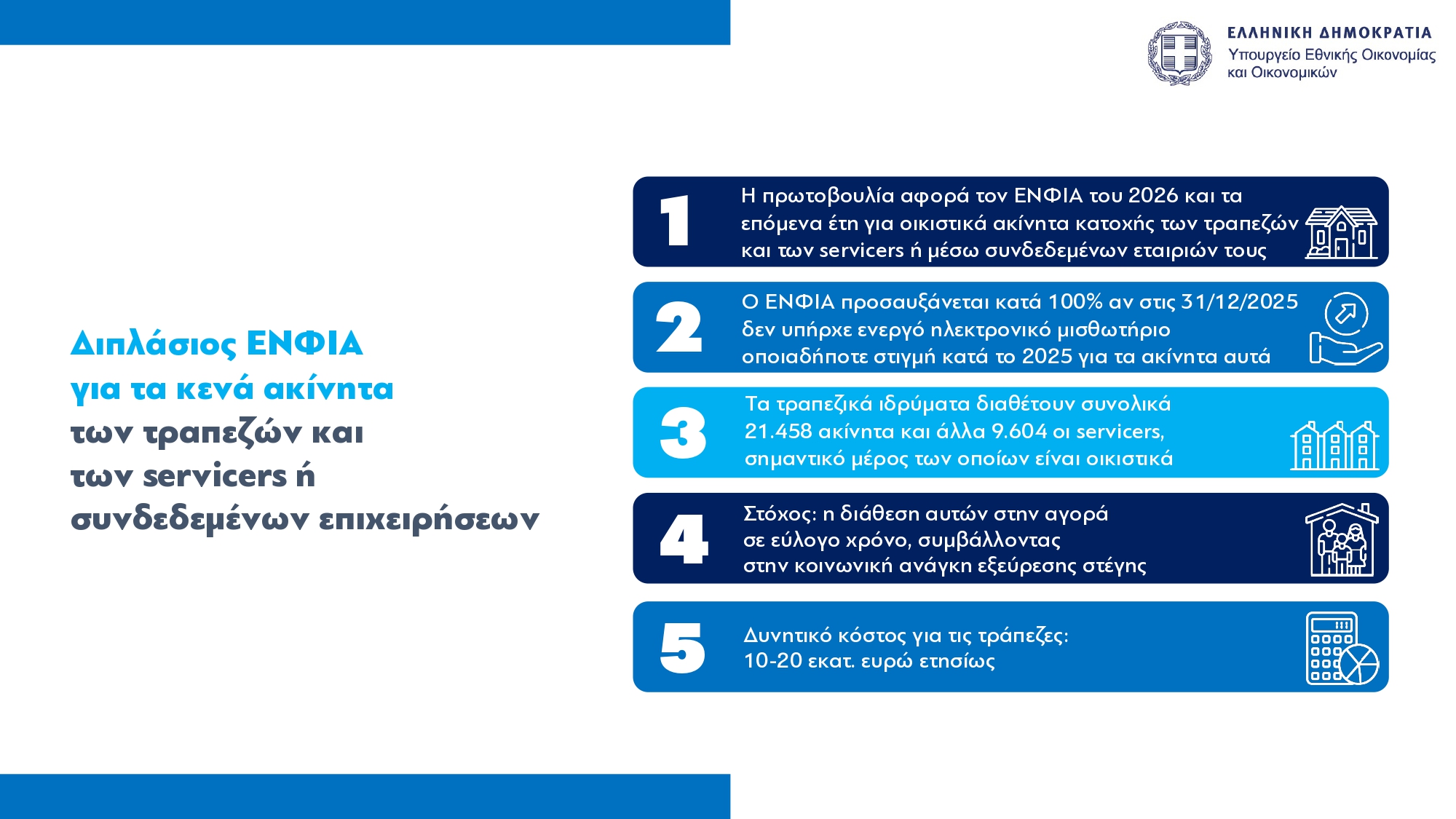 - Διπλασιασμός του ΕΝΦΙΑ για κενά οικιστικά ακίνητα που έχουν στην ιδιοκτησία τους οι τράπεζες και οι servicers, ώστε να διοχετευτούν στην αγορά. Η πρωτοβουλία αφορά τον ΕΝΦΙΑ του 2026 και τα επόμενα έτη. Έτσι, ο ΕΝΦΙΑ προσαυξάνεται κατά 100% αν στις 31/12/2025 δεν υπήρχε ενεργό ηλεκτρονικό μισθωτήριο οποιαδήποτε στιγμή κατά το 2025 για τα ακίνητα αυτά. Τονίζεται πως τα τραπεζικά ιδρύματα διαθέτουν συνολικά 21.500 ακίνητα και άλλα 10.000 περίπου οι servicers, σημαντικό μέρος των οποίων είναι οικιστικά. Στόχος είναι τα ακίνητα αυτά να διατεθούν σε ένα εύλογο χρόνο στην αγορά προκειμένου να συμβάλλουν στην κοινωνική ανάγκη εξεύρεσης στέγης. Το δυνητικό κόστος για τις τράπεζες ανέρχεται σε 10 έως 20 εκατ. ευρώ ετησίως.
