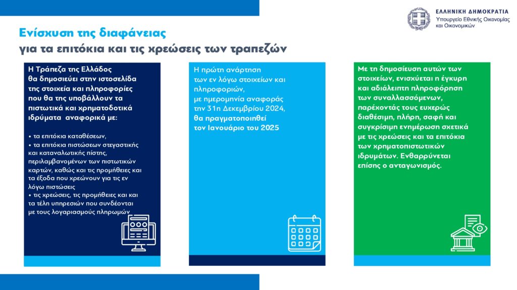 - Ενισχύεται η διαφάνεια, ο ανταγωνισμός και το πλαίσιο ενημέρωσης των πολιτών, οι οποίοι πλέον θα μπορούν να συγκρίνουν επιτόκια καταθέσεων και πιστώσεων, καθώς και χρεώσεις αλλά και προμήθειες που συνδέονται με τους λογαριασμούς πληρωμών. Η πληροφόρηση αυτή θα είναι διαθέσιμη στον ιστοχώρο της Τράπεζας της Ελλάδας. Η πρώτη σχετική ανάρτηση των εν λόγω στοιχείων θα πραγματοποιηθεί τον Ιανουάριο του 2025.