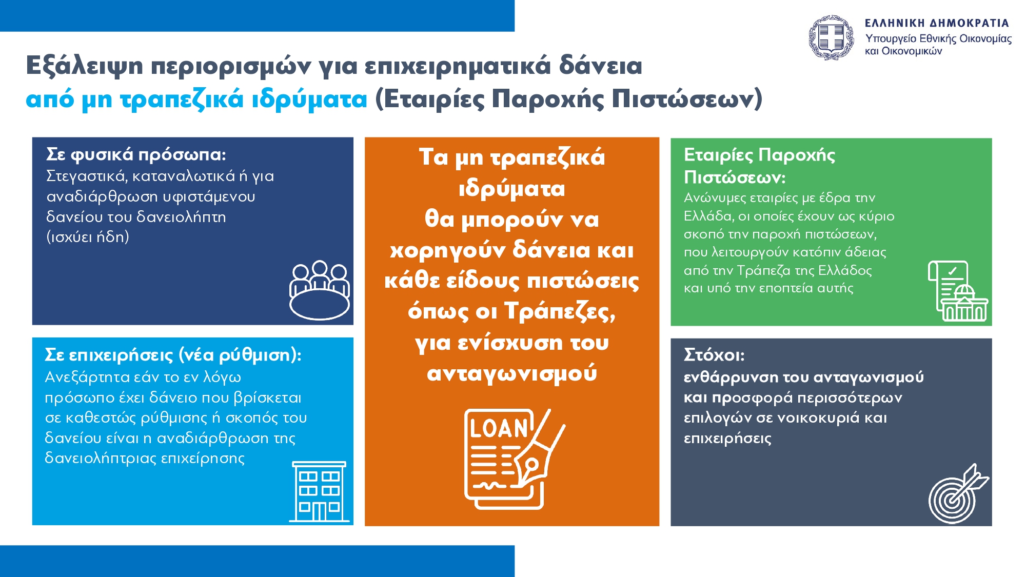 - Ενισχύεται ο ανταγωνισμός στο χρηματοπιστωτικό σύστημα και η πρόσβαση σε δανεισμό καθώς απαλείφονται οι περιορισμοί στη χρηματοδότηση από τις Εταιρείες Παροχής Πιστώσεων. Πλέον, οι Εταιρίες αυτές θα μπορούν να χορηγούν δάνεια και κάθε είδους πιστώσεις- όπως κάνουν οι τράπεζες – με στόχο να ενισχυθεί ο ανταγωνισμός και προσφέρονται περισσότερες επιλογές σε επιχειρήσεις και νοικοκυριά. Υπενθυμίζεται ότι για φυσικά πρόσωπα επιτρέπεται ήδη η χορήγηση στεγαστικών και καταναλωτικών δανείων ή παροχή δανείων για αναδιάρθρωση υφιστάμενου δανείου. Η νέα ρύθμιση αφορά στις επιχειρήσεις, καθώς θα επιτρέπεται η χορήγηση δανείων ανεξάρτητα εάν το εν λόγω πρόσωπο έχει δάνειο που βρίσκεται σε καθεστώς ρύθμισης ή σκοπός του δανείου είναι η αναδιάρθρωση της δανειοληπτικής επιχείρησης. Οι Εταιρίες Παροχής Πιστώσεων είναι ανώνυμες εταιρίες οι οποίες έχουν ως κύριο σκοπό την παροχή πιστώσεων που λειτουργούν κατόπιν άδειας της Τράπεζας της Ελλάδας και υπό την εποπτεία αυτής.
