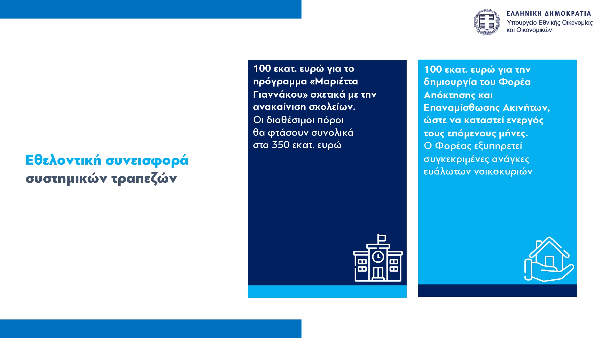 - Οι συστημικές τράπεζες θα διαθέσουν 100 εκατ. ευρώ για το πρόγραμμα «Μαριέττα Γιαννάκου» για την ανακατασκευή σχολείων. Οι διαθέσιμοι πόροι για το εν λόγω πρόγραμμα θα φτάσουν συνολικά στα 350 εκατ. ευρώ. Επιπλέον, οι ίδιες τράπεζες θα διαθέσουν 100 εκατ. ευρώ για την δημιουργία του Φορέα Απόκτησης και Επαναμίσθωσης Ακινήτων, ώστε να καταστεί ενεργός τους επόμενους μήνες. Ήδη η διαγωνιστική διαδικασία έχει ξεκινήσει και έχουν προκύψει οι ενδιαφερόμενοι επενδυτές, ενώ διαπιστώθηκε η ανάγκη συνδρομής και του ελληνικού τραπεζικού τομέα προκειμένου να καταστεί βιώσιμη η επένδυση. Ο Φορέας εξυπηρετεί συγκεκριμένες ανάγκες ευάλωτων οφειλετών που οδηγούνται σε πτώχευση ή σε αναγκαστική εκτέλεση πράξης. Ο Φορέας αποτελεί «καταφύγιο» για αυτούς καθώς θα αποκτά την πρώτη κατοικία του ευάλωτου οφειλέτη, μετά από αντίστοιχο αίτημα μεταβίβασης, προκειμένου στη συνέχεια να την επαναμισθώνει σε αυτόν. Η περίοδος της επαναμίσθωσης θα φτάνει τα 12 χρόνια όπου κατά τη διάρκεια της μίσθωσης ή στη λήξη αυτής, ο οφειλέτης θα μπορεί να ασκήσει το δικαίωμα του για επαναγορά του ακινήτου.
