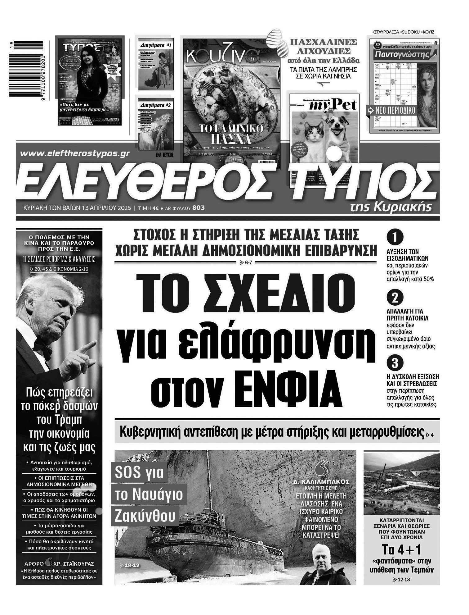 Οσον αφορά τον ΕΝΦΙΑ, ο υπουργός απέκλεισε κατηγορηματικά το ενδεχόμενο κατάργησής του για όλους, όπως είχε υποστηριχθεί από δημοσιεύματα του ηλεκτρονικού Τύπου, όχι όμως και την πιθανότητα να αποφασιστούν νέες ελαφρύνσεις και στον φόρο αυτόν. Ανέφερε συγκεκριμένα ότι: «Ακούω τις τελευταίες ημέρες σενάρια περί κατάργησης ΕΝΦΙΑ. Είμαστε μία κυβέρνηση η οποία έχει ήδη μειώσει τον ΕΝΦΙΑ κατά 35% και άλλο 20% στα ακίνητα που έχουν ασφαλιστεί. Δεν θα ήταν αυτή η προτεραιότητά μας».