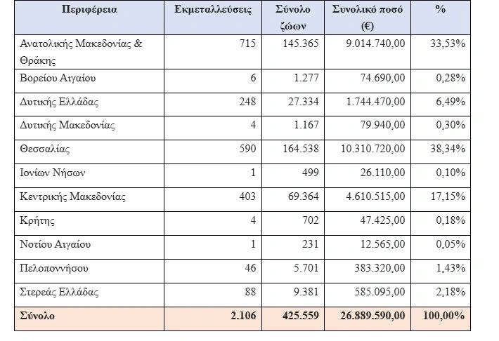Από το συνολικό ποσό των 26.889.590 ευρώ, τα 23.990.050 ευρώ (89,2%) αντιστοιχούν στα «μεγάλα» ζώα και τα 2.899.540 ευρώ (10,8%) στα «μικρά» ζώα.