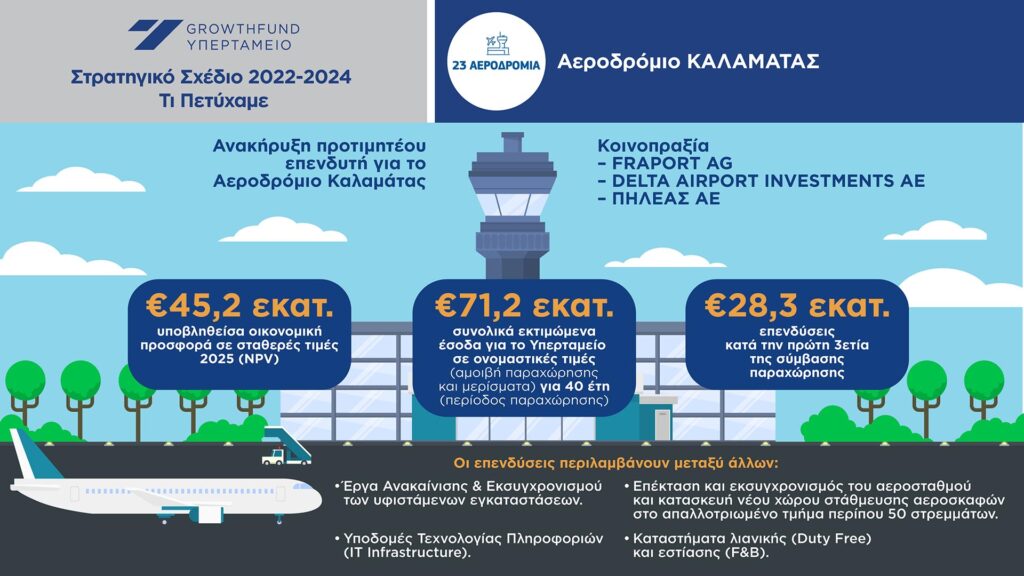 Μαζί με την οικονομική βελτίωση, δόθηκε μεγάλη εστίαση στα στρατηγικά έργα. Την τριετία 2022-2024 το Υπερταμείο ολοκλήρωσε την παραχώρηση του αεροδρομίου Καλαμάτας, «ξεκλείδωσε» το έργο Ανάπλασης της ΔΕΘ σε συνεργασία με τη Διοίκηση της εταιρείας και τους φορείς με στόχο την άμεση εκκίνηση του διαγωνισμού. Στην ΑΕΔΙΚ ξεκίνησε η προετοιμασία για την ανάπτυξη του real estate, στον ΟΚΑΑ και την ΚΑΘ προχωρούν οι μελέτες σκοπιμότητας για τη δημιουργία μίας ενιαίας Εθνικής Αγοράς, ενώ γίνεται η προεργασία για την είσοδο στρατηγικού επενδυτή στις Ελληνικές Αλυκές.