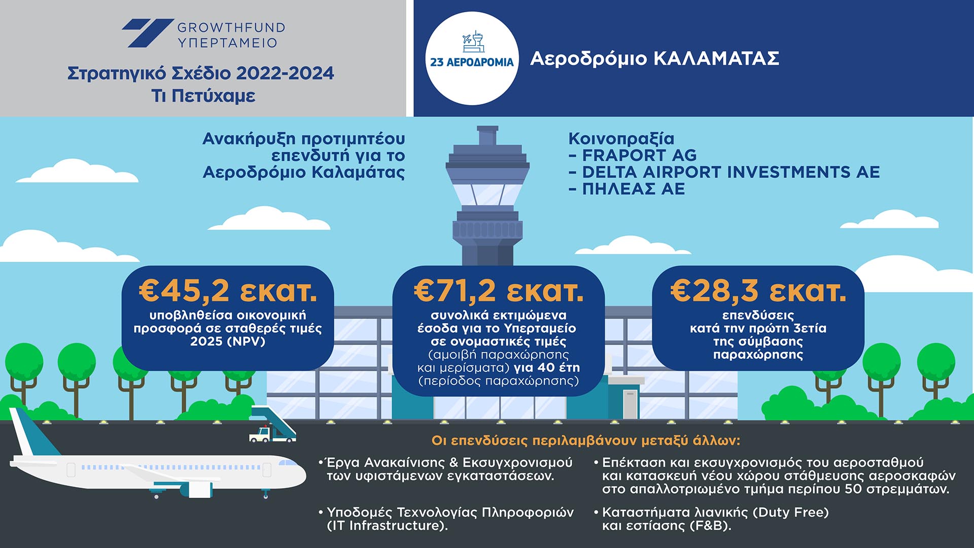 - Επίσης, να έχει ολοκληρωθεί η προσέλκυση στρατηγικού επενδυτή για τις Ελληνικές Αλυκές καθώς και να έχει ξεκινήσει το αναπτυξιακό σχέδιο για το αεροδρόμιο της Καλαμάτας.