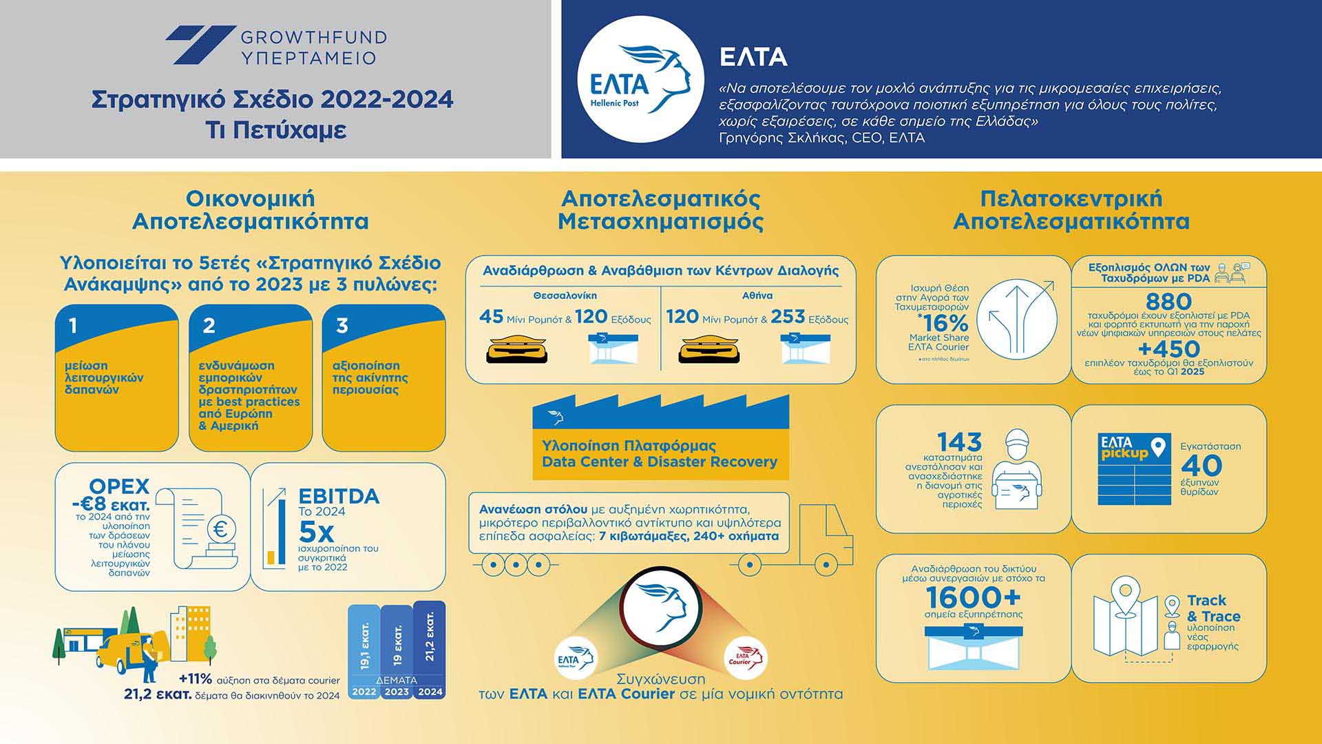 Τα Ελληνικά Ταχυδρομεία με νέα διοίκηση ξεκίνησαν την ανάκαμψή τους, εστιάζοντας σε τρεις πυλώνες: μείωση λειτουργικών δαπανών, ενδυνάμωση εμπορικών δραστηριοτήτων και αξιοποίηση ακίνητης περιουσίας. Το 2024 πετύχαν μείωση των ΟPEX κατά €8 εκατ. και 5πλάσιο EBITDA συγκριτικά με το 2022. Εντός του έτους θα διακινηθούν συνολικά 21,2 εκατ. δέματα (αύξηση +11% vs 2022).