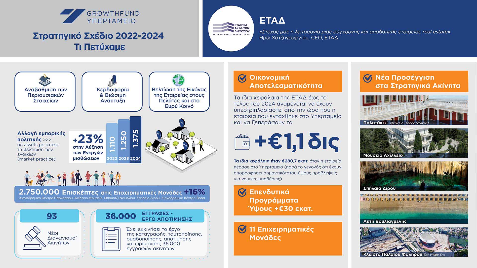 Η ΕΤΑΔ κατέγραψε αύξηση 23% των ενεργών μισθώσεων, ωρίμασε 770 νέα ακίνητα, ολοκλήρωσε 99 Διαγωνισμούς και εφαρμόζει νέα φιλοσοφία στα στρατηγικά ακίνητα (Ακτή Βουλιαγμένης, Παλατάκι, Taekwondo κ.α.). Η εταιρεία όταν αναλήφθηκε ο έλεγχός της από το Υπερταμείο είχε ζημιογόνες χρήσεις αλλά πλέον έχει εισέλθει σε τροχιά κερδοφορίας. Τα ετήσια έσοδα αναμένεται να προσεγγίσουν το 2024 τα €60 εκατ. (+59% σε σχέση με το 2015), ενώ τα ίδια κεφάλαια αναμένεται να ξεπεράσουν τα €1,1 δισ., σε σχέση με €280,7 εκατ. από όταν εντάχθηκε στο Υπερταμείο.