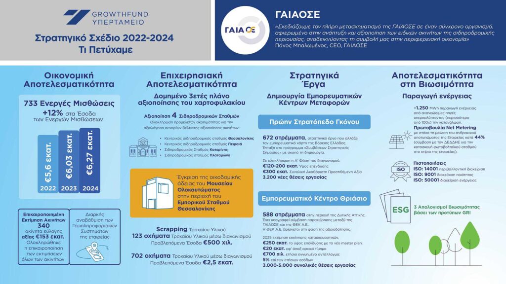 Η ΓΑΙΑΟΣΕ πραγματοποιεί τα υψηλότερα έσοδα από ιδρύσεώς της έχοντας ξεπεράσει τα €20 εκατ./έτος τα 3 τελευταία έτη. Η καθαρή θέση της εταιρείας από την ημερομηνία ένταξής της στον Όμιλο του Υπερταμειου έχει τριπλασιαστεί κι έφτασε στα €234 εκατ. το 2023 έναντι €75 εκατ. Οι προοπτικές της διαγράφονται θετικές ενώ η νέα Διοίκηση μέσα από ένα δομημένο πλάνο εστιάζει στη σιδηροδρομική ακίνητη περιουσία και στη δημιουργία κέντρων logistics που θα αλλάξουν τις εμπορευματικές δυνατότητες της χώρας.