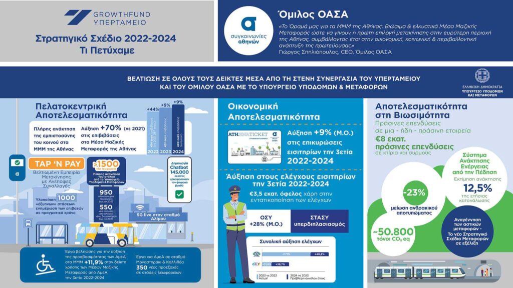 Οι Συγκοινωνίες Αθηνών (Όμιλος ΟΑΣΑ) συνεχίζουν να επιτελούν τον κοινωνικό τους ρόλο, καθώς, παρά τη σημαντική αύξηση του κόστους ενέργειας, η τιμή εισιτηρίου από €1,40 το έτος 2014 – δέκα χρόνια μετά – είναι χαμηλότερη στα €1,2. Η αναδιοργάνωση του Ομίλου έχει αρχίσει να αποδίδει καρπούς. Οι Συγκοινωνίες Αθηνών ανέκτησαν την εμπιστοσύνη του κοινού καταγράφοντας αύξηση κατά 70% στις επιβιβάσεις (2021-2024). Η πλήρης ανανέωση του στόλου έχει εκκινήσει από το Υπουργείο Υποδομών & Μεταφορών, με τη συνεργασία του Ομίλου ΟΑΣΑ. Νέες υπηρεσίες προστέθηκαν, όπως το σύστημα Tap ‘n Pay για Ανέπαφες Συναλλαγές, ενώ γίνονται σημαντικές παρεμβάσεις για την καλύτερη εξυπηρέτηση των ΑμεΑ.