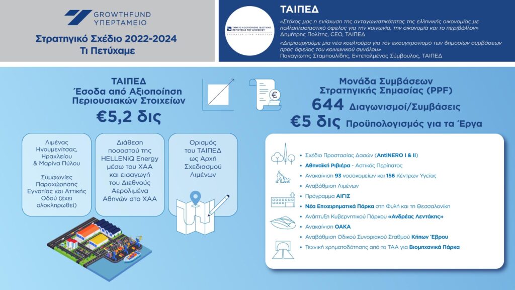 Το ΤΑΙΠΕΔ πραγματοποίησε έσοδα €5,2 δισ. αξιοποιώντας περιουσιακά στοιχεία για το πρόγραμμα αποκρατικοποιήσεων. Πολύ σημαντική ήταν η δημιουργία της Μονάδας Συμβάσεων Στρατηγικής Σημασίας (PPF), η οποία σχεδιάστηκε και στελεχώθηκε από το Growthfund. Η μονάδα διαχειρίζεται έργα ύψους €8 δις και έχει συμβάλει στην επιτυχή διενέργεια σειράς διαγωνισμών προς όφελος του δημοσίου.