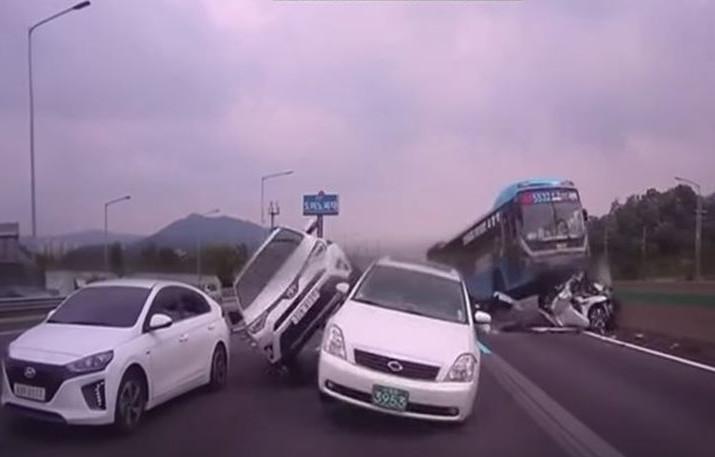 Ένα πούλμαν, που φαίνεται να έρχεται με υπερβολική ταχύτητα χωρίς φρένα, βρέθηκε στον αέρα παρασύροντας πολλά αυτοκίνητα και καταστρέφοντας ολοκληρωτικά ένα με τους μπροστινούς του τροχούς.
