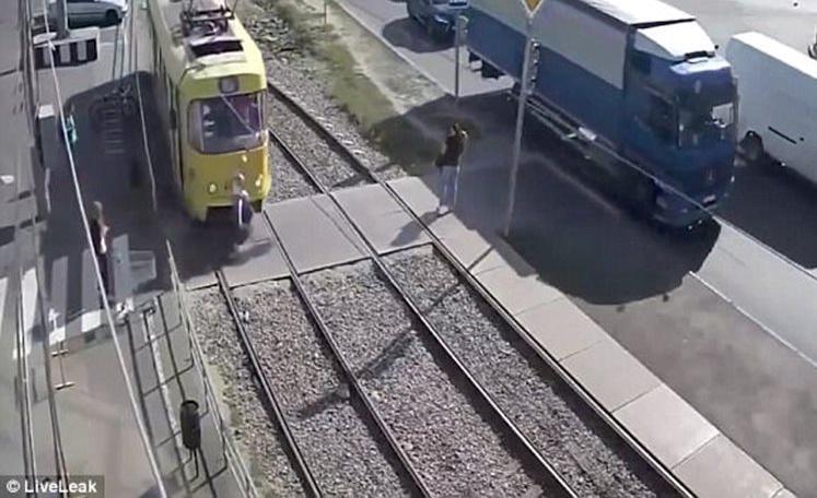 Στο βίντεο φαίνεται η γυναίκα να αγνοεί τα προειδοποιητικά σήματα καθώς το τραμ είναι εμφανές ότι πλησιάζει τη διάβαση που ετοιμάζεται να χρησιμοποιήσει, καθώς είναι απασχολημένη με το κινητό της τηλέφωνο.