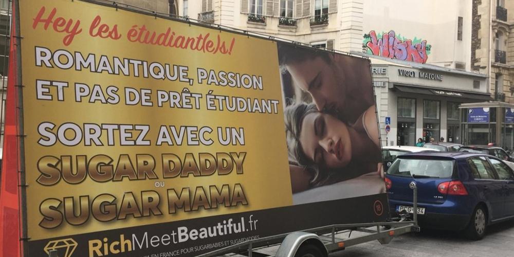 «Γεια σας, φοιτήτριες» γράφει η γιγαντοαφίσα, πάνω σε ένα φορτηγό, που διαφημίζει στη γαλλική πρωτεύουσα την ιστοσελίδα RichMeetBeautiful.fr.