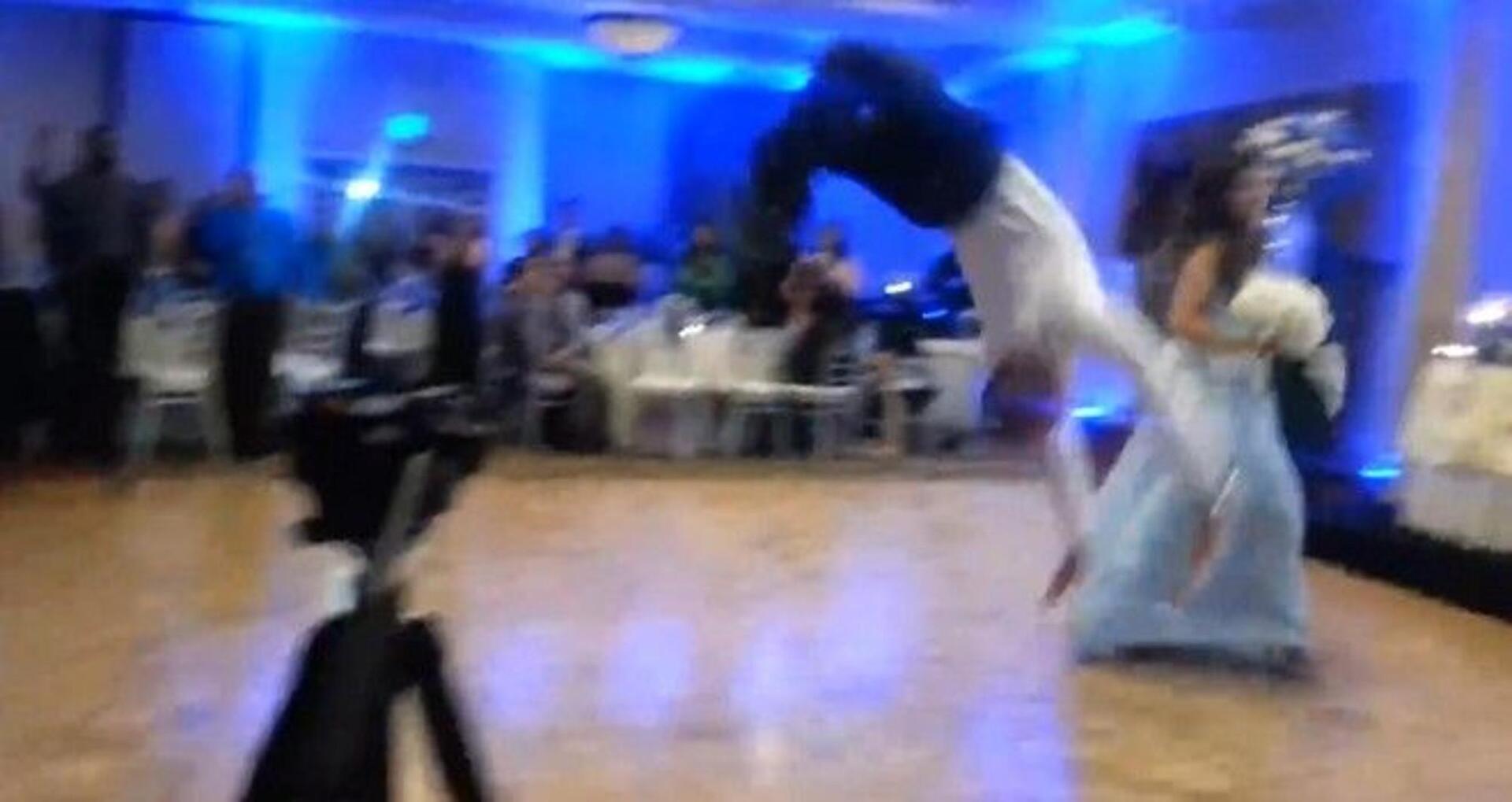Ιδιαίτερα ευτυχείς και χαρούμενοι οι νεόνυμφοι ανέβηκαν στην πίστα και προσπάθησαν να ξεσηκώσουν τους καλεσμένους, αλλά τα πράγματα δεν εξελίχθηκαν όπως ακριβώς θα περίμεναν. Και αυτό γιατί ο υπερβάλλων ζήλος του γαμπρού να δείξει τις μοναδικές χορευτικές του ικανότητες λίγο έλειψε να στείλει “αδιάβαστη” τη νύφη που σωριάστηκε στο έδαφος, από μια κίνηση που συνδύασε καράτε, χορό και ρυθμική γυμναστική ταυτόχρονα.