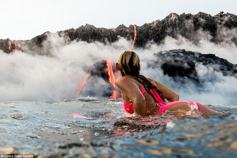 Αυτή τη φορά η συγκίνηση την περίμενε δίπλα σε ένα ενεργό ηφαίστειο στη Χαβάη, όπου αποφάσισε να κάνει σερφ ενώ η λάβα πετάγεται γύρω της.