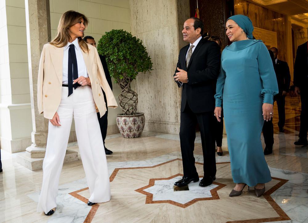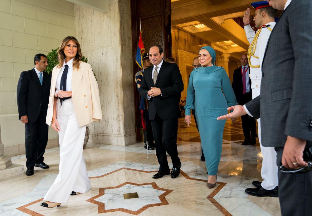 Η Μελάνια Τραμπ για την εμφάνισή της επέλεξε ένα λευκό κοστούμι και μπλε γραβάτα, εντυπωσιάζοντας τους παρευρισκόμενους και φυσικά τον πρόεδρο της Αιγύπτου.