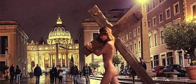 Τελευταίο τους «χτύπημα» η φωτογραφία της κοπέλας χωρίς ρούχα μπροστά από τη Βασιλική του Αγίου Πέτρου στο Βατικανό, κουβαλώντας ένα ξύλινο, μεγάλο σταυρό.