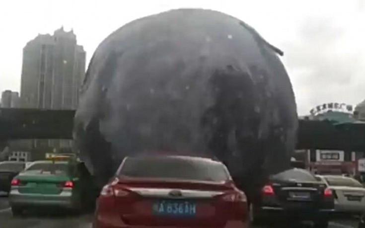 Η ελαφρώς ξεφουσκωμένη μάζα έπεσε κατά μήκος αυτοκινητόδρομου στο Fuzhou, στην επαρχία Fujian, καταλαμβάνοντας δύο ολόκληρες λωρίδες με τον όγκο της. Το φουσκωτό φεγγάρι άρχισε τη διαδρομή του τρόμου για όσους το βρήκαν μπροστά τους όταν ισχυροί άνεμοι το παρέσυραν από το πλωτό φεστιβάλ στο οποίο ήταν «αγκυροβολημένο».