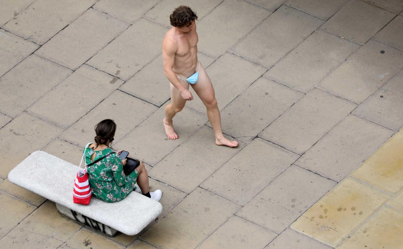 Καθώς ο άνδρας αυτός περπατούσε ανέμελος στην Όξφορντ Στριτ, ολόγυμνος εξαιρουμένης της γαλάζιας μάσκας που έκρυβε τα γεννητικά του όργανα, κάποιοι τραβούσαν φωτογραφίες με τα κινητά τηλέφωνά τους ενώ άλλοι απλώς τον κοίταζαν με περιέργεια.