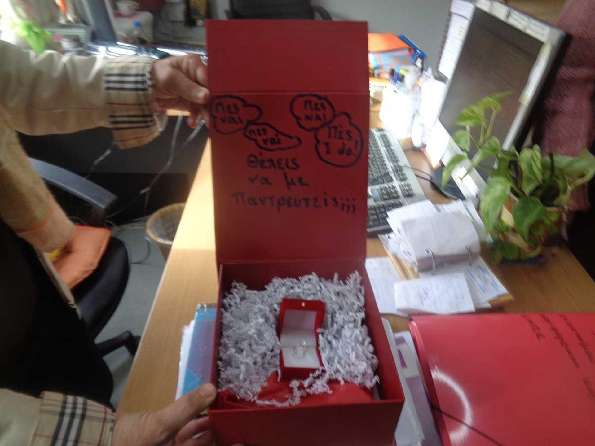 Ο… Άγιος Βασίλης, αφού έδωσε τα δώρα σε μικρά παιδιά των υπαλλήλων, έδωσε και ένα δώρο σε εργαζόμενη με την οποία διατηρεί σχέση, το οποίο ήταν ένα δαχτυλίδι, ενώ στο κουτί του έγραφε: «Θέλεις να με παντρευτείς; Πες ναι!».