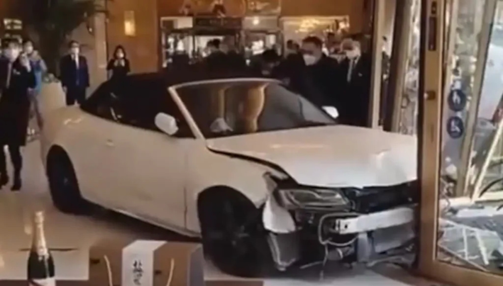 Βίντεο που αναρτήθηκαν σε μέσα κοινωνικής δικτύωσης δείχνουν τη σκηνή: ένα λευκό κάμπριο που προσκρούει στην είσοδο του ξενοδοχείου Central Hotel της Σανγκάης προτού κάνει όπισθεν για να συνεχίσει στη συνέχεια την πορεία του μέσα στην αίθουσα υποδοχής του ξενοδοχείου.