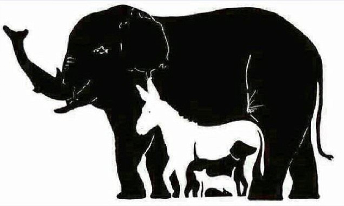 Μετά από προσεκτική παρατήρηση, φαίνεται ότι στην εικόνα υπάρχει ένας ελέφαντας, ένα γαϊδούρι, ένας σκύλος, μια γάτα, ένας αρουραίος, ένα φίδι, ένα δελφίνι, μια χελώνα και ένα ψάρι.