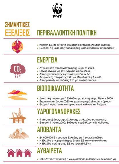 Στις θετικές εξελίξεις του έτους, εκτός από την πρωθυπουργική δέσμευση για απεξάρτηση της χώρας από τον λιγνίτη και την απαγόρευση των πλαστικών, συγκαταλέγονται η θέσπιση του Εθνικού Ταμείου Δίκαιης Μετάβασης και το φιλόδοξο Εθνικό Σχέδιο για την Ενέργεια και το Κλίμα, ειδικά σε ό,τι αφορά τις ΑΠΕ και την ενεργειακή εξοικονόμηση. Επίσης, η αποφυγή του νομοσχεδίου για τον αιγιαλό, που κατατέθηκε στη Βουλή, τον Απρίλιο, από την προηγούμενη κυβέρνηση και επέτρεπε παραχωρήσεις χρήσης και τακτοποιήσεις αυθαιρέτων στην παράκτια και παρόχθια ζώνη.