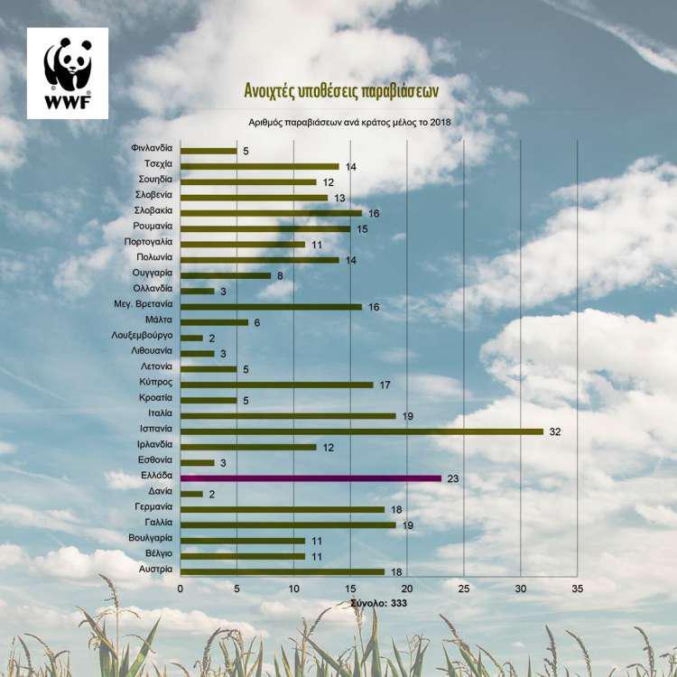 Στις αρνητικές εξελίξεις του 2019, πάντως, συμπεριλαμβάνονται ακόμη η παραπομπή της Ελλάδας στο Δικαστήριο της Ευρωπαϊκής Ένωσης για ελλιπή εφαρμογή των οδηγιών περί το δίκτυο Natura 2000 και η δεύτερη θέση της χώρας (μετά την Ισπανία) σε 23 ανοικτές υποθέσεις παραβίασης του περιβαλλοντικού δικαίου της ΕΕ των 28, με αποτέλεσμα την επιβολή υψηλών χρηματικών προστίμων.