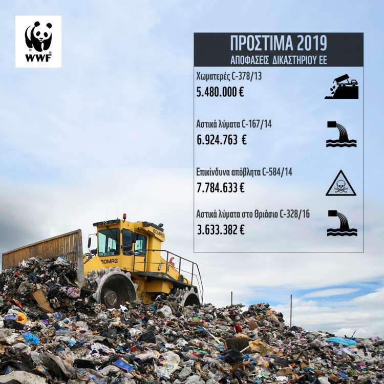 Στις αρνητικές εξελίξεις περί την περιβαλλοντική πολιτική για το 2019, καταγράφεται στην έκθεση του WWF και ο μη επαρκής περιβαλλοντικός έλεγχος, καθώς και η ασθενής πολιτική επιβολής και συλλογής προστίμων, δεδομένου ότι από τις φετινές 83 αποφάσεις επιβολής προστίμων συνολικού ύψους 1,5 και πλέον εκατομ. ευρώ, που είχαν εισηγηθεί οι ελεγκτές περιβάλλοντος στον τότε αρμόδιο υπουργό, Σ. Φάμελλο, οι 73 παραμένουν ανυπόγραφες. «Τα απόβλητα είναι ο τομέας που συγκεντρώνει στην Ελλάδα τον κυριότερο όγκο παραβάσεων, όπως και η αυθαίρετη δόμηση, για την οποία, ωστόσο, δεν υπάρχει ελεγκτικός μηχανισμός» σημείωσε η κ. Νάντσου.