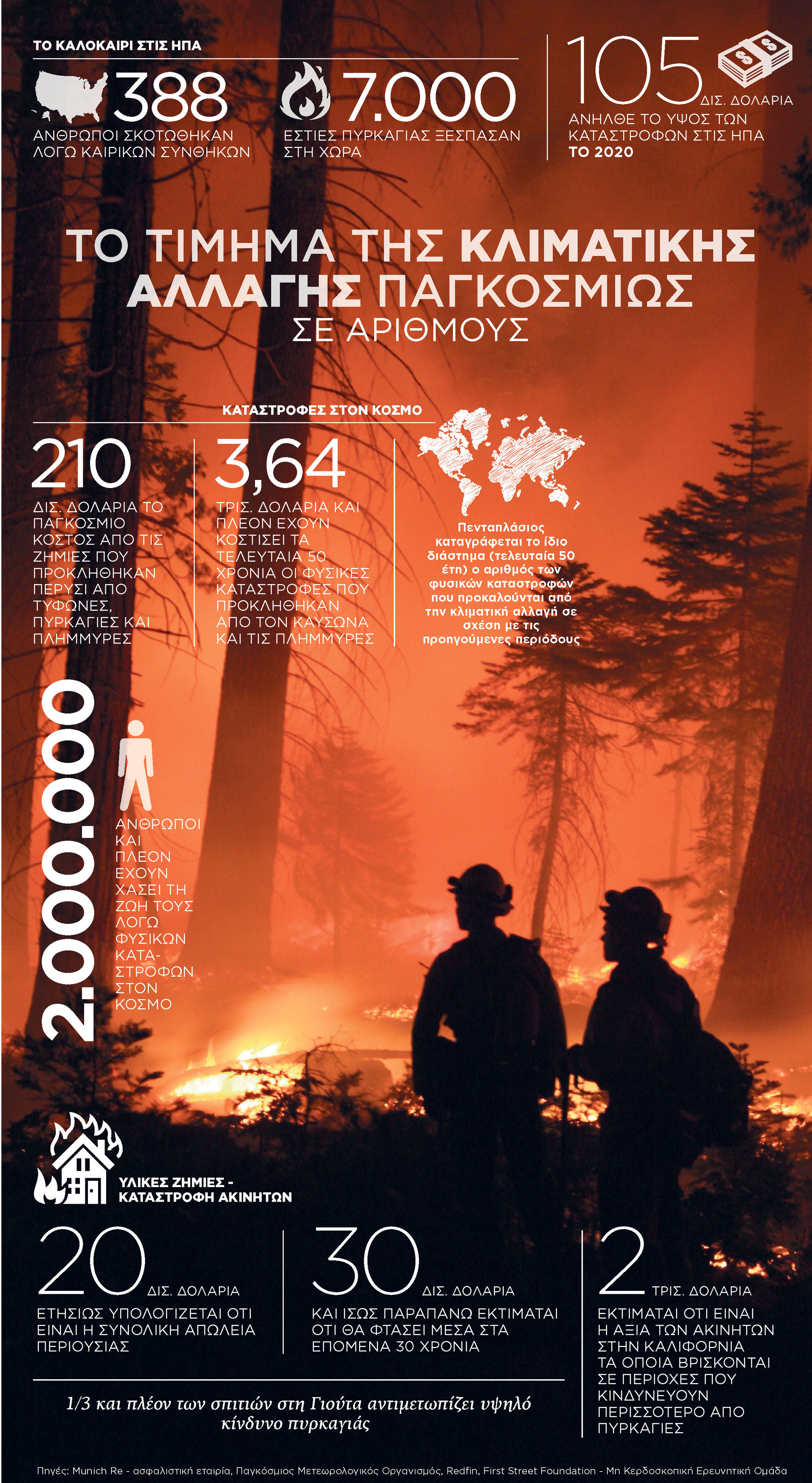 Εκθεση της Swiss Re διαπίστωσε ότι πέρυσι οι ακραίες καιρικές συνθήκες προκάλεσαν συνολικά ζημιές 105 δισεκατομμυρίων δολαρίων στις ΗΠΑ. Στην Καλιφόρνια, ακίνητα αξίας 2 τρισεκατομμυρίων δολαρίων βρίσκονται σε περιοχές που κινδυνεύουν περισσότερο από πυρκαγιές, σύμφωνα με τη Redfin.