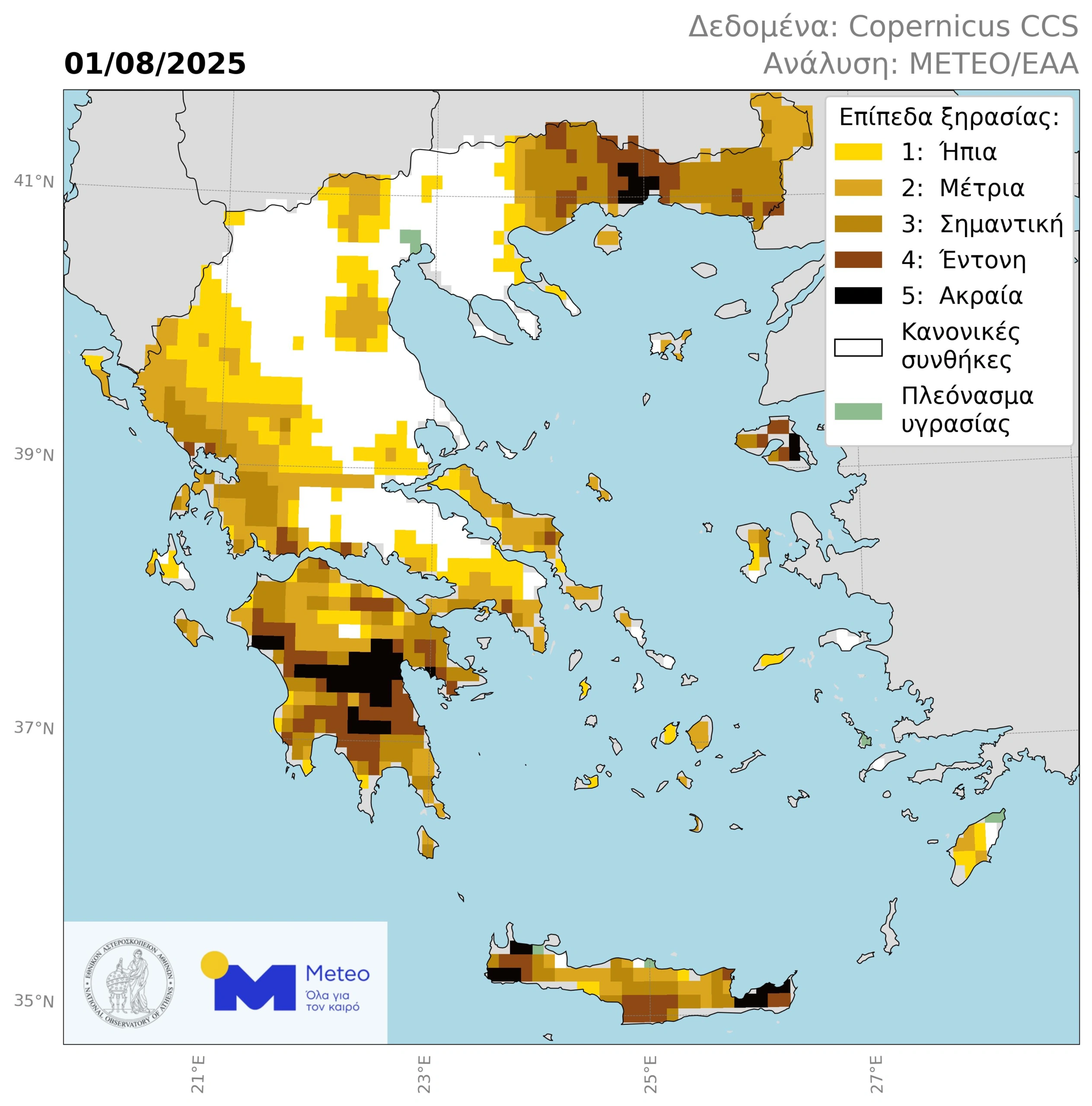 Όπως προκύπτει από την ανάλυση του meteo του Εθνικού Αστεροσκοπείου Αθηνών με εξαίρεση αρκετές περιοχές της Μακεδονίας, της Θεσσαλίας και της κεντρικής Στερεάς Ελλάδας, η χώρα βρίσκεται σε συνθήκες ξηρασίας.