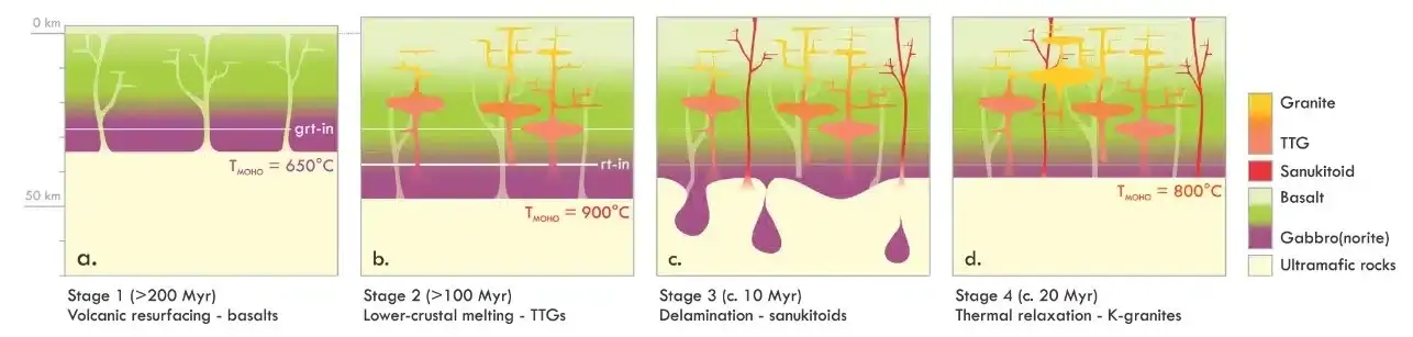 Και συνέχισε λέγοντας: «Το δικό μας είναι ένα απλό μοντέλο στο οποίο τα TTG, καθώς και τα νεότερα πετρώματα με τα οποία συνδέονται συνήθως τα TTG, προέκυψαν από την αργή ταφή, πάχυνση και τήξη του πρόδρομου φλοιού που πιθανότατα έμοιαζε με ωκεάνια οροπέδια. Ο ηπειρωτικός φλοιός προοριζόταν να αναπτυχθεί με τον τρόπο που έγινε, επειδή συνέχιζε να θάβεται περαιτέρω και οι βράχοι στη βάση του δεν είχαν άλλη επιλογή από το να λιώσουν. Δημιούργησαν τα TTG που αποδείχθηκαν μια νικητήρια συνταγή για την επιβίωση και την ανάπτυξη στην ηπειρωτική χώρα».