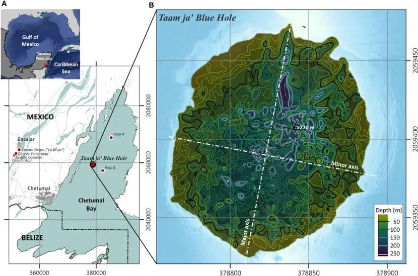 Είναι πιθανότατα «η βαθύτερη γνωστή μπλε τρύπα στην περιοχή», σύμφωνα με τους επιστήμονες, οι οποίοι συνδέονταν με το δημόσιο ερευνητικό κέντρο El Colegio de la Frontera Sur (Ecosur).