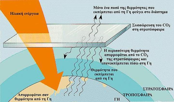Η ηλιακή ενέργεια περνάει μέσα από την ατμόσφαιρα θερμαίνοντας την. Τα αέρια του θερμοκηπίου, όπως το διοξείδιο του άνθρακα, δρουν σαν μια κουβέρτα, παγιδεύοντας θερμότητα κοντά στην επιφάνεια της γης, αυξάνοντας τη θερμοκρασία.