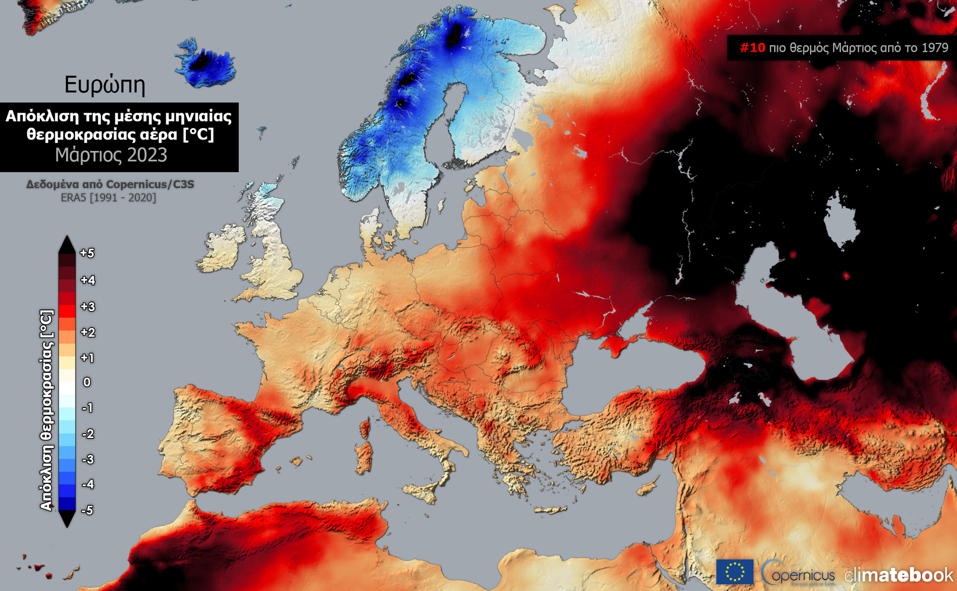 Η μέση θερμοκρασία του Μαρτίου 2023 στην Ευρώπη κυμάνθηκε κατά 0,85°C πάνω από τα επίπεδα της περιόδου 1991-2020, ενώ παγκοσμίως κατά 0,51°C πάνω από τα επίπεδα της περιόδου 1991-2020. Οι μεγαλύτερες θετικές αποκλίσεις θερμοκρασίας έως +4°C με +6°C, καταγράφηκαν σε περιοχές της Νότιας και Κεντρικής Ευρώπης καθώς και σε περιοχές της Νοτιοδυτικής Ρωσίας. Αρνητικές αποκλίσεις σημειώθηκαν μόνο σε περιοχές της Σκανδιναβικής Χερσονήσου.