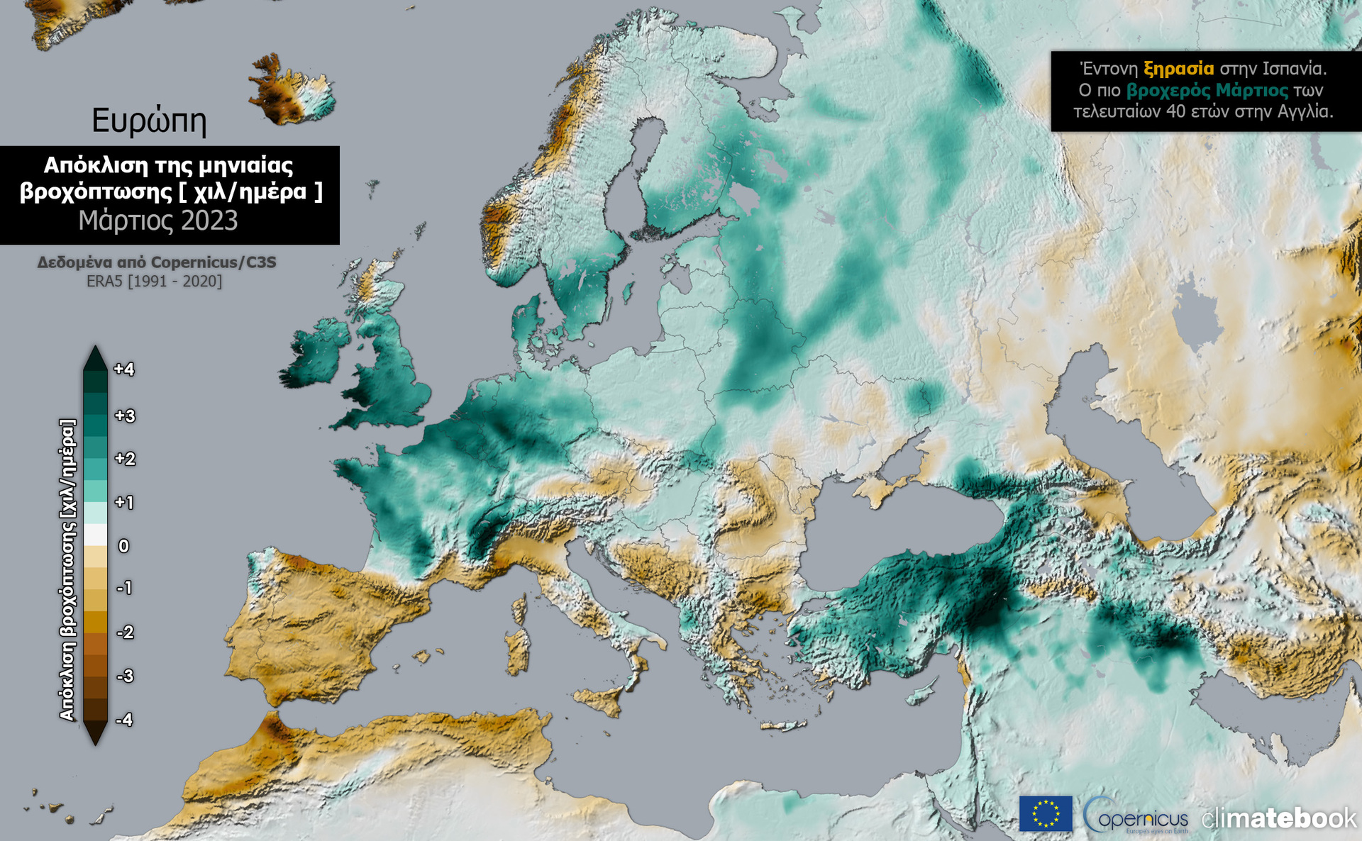 Επιπλέον, έντονη ξηρασία με απουσία βροχής καθ’ όλη τη διάρκεια του μήνα παρατηρήθηκε σε περιοχές της Δυτικής Ευρώπης, όπως στην Ισπανία καθώς και στα Βαλκάνια. Στον αντίποδα, αυξημένες βροχοπτώσεις σημειώθηκαν σε Γαλλία και Αγγλία, όπου στην τελευταία καταγράφηκε ο πιο βροχερός Μάρτιος των τελευταίων 40 ετών.