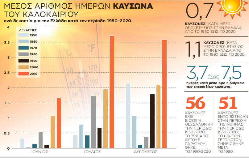 Σύμφωνα με τα συμπεράσματα της έρευνας, η χώρα μας αντιμετωπίζει κατά μέσο όρο 0,7 καύσωνες ετησίως από το 1950 έως το 2020. Η μέση τιμή αυτή έχει αυξηθεί σε 1,1 καύσωνα ετησίως από το 1990 έως το 2020.
