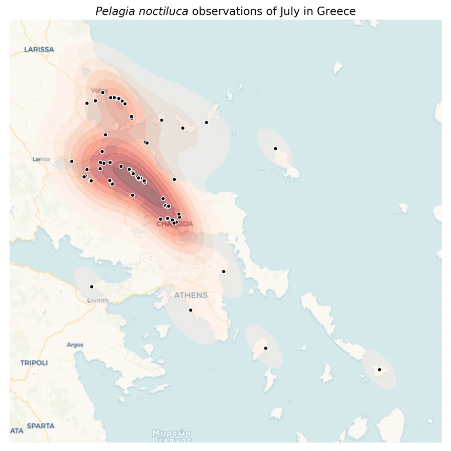 Το Παρατηρητήριο δημοσίευσε και χάρτες με επιβεβαιωμένες καταγραφές μωβ μεδουσών τον Ιούλιο στην Ελλάδα. Οι μαύρες κουκίδες στον χάρτη δείχνουν τις επιβεβαιωμένες καταγραφές του Ιουλίου. Η κόκκινη σκίαση απεικονίζει την εξάπλωσή τους: όσο πιο έντονη είναι η απόχρωση, τόσο πιο συχνή και σοβαρή είναι η παρουσία τους. Οι περιοχές με απαλό κόκκινο έχουν μεμονωμένα ή περιστασιακά περιστατικά, που αλλάζουν ανάλογα με τα θαλάσσια ρεύματα.