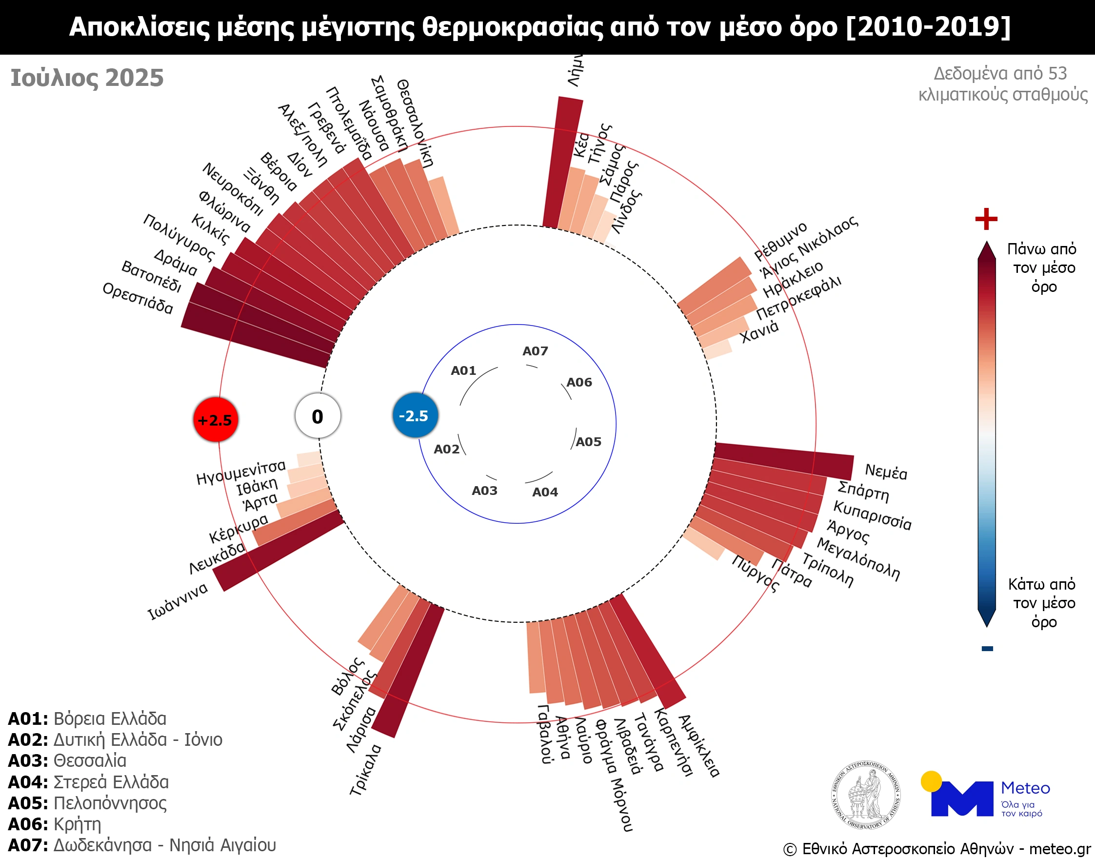 Σύμφωνα με το δίκτυο των 53 μετεωρολογικών σταθμών του meteo.gr του Εθνικού Αστεροσκοπείου Αθηνών (ΕΑΑ) που λειτουργούν ανελλιπώς από το 2010 μέχρι σήμερα, τον Ιούλιο του 2025 η μέση τιμή των μεγίστων ημερήσιων θερμοκρασιών κυμάνθηκε πάνω από τα κανονικά για την εποχή επίπεδα σε όλες τις περιοχές της χώρας (σε σχέση με τον μέσο όρο της περιόδου 2010-2019). Όπως τονίζει το meteo.gr/EAA, o Ιούλιος του 2025 χαρακτηρίστηκε από σταθερά υψηλές θερμοκρασίες, με αποκορύφωμα τα διαδοχικά κύματα καύσωνα την περίοδο 14-28 Ιουλίου.