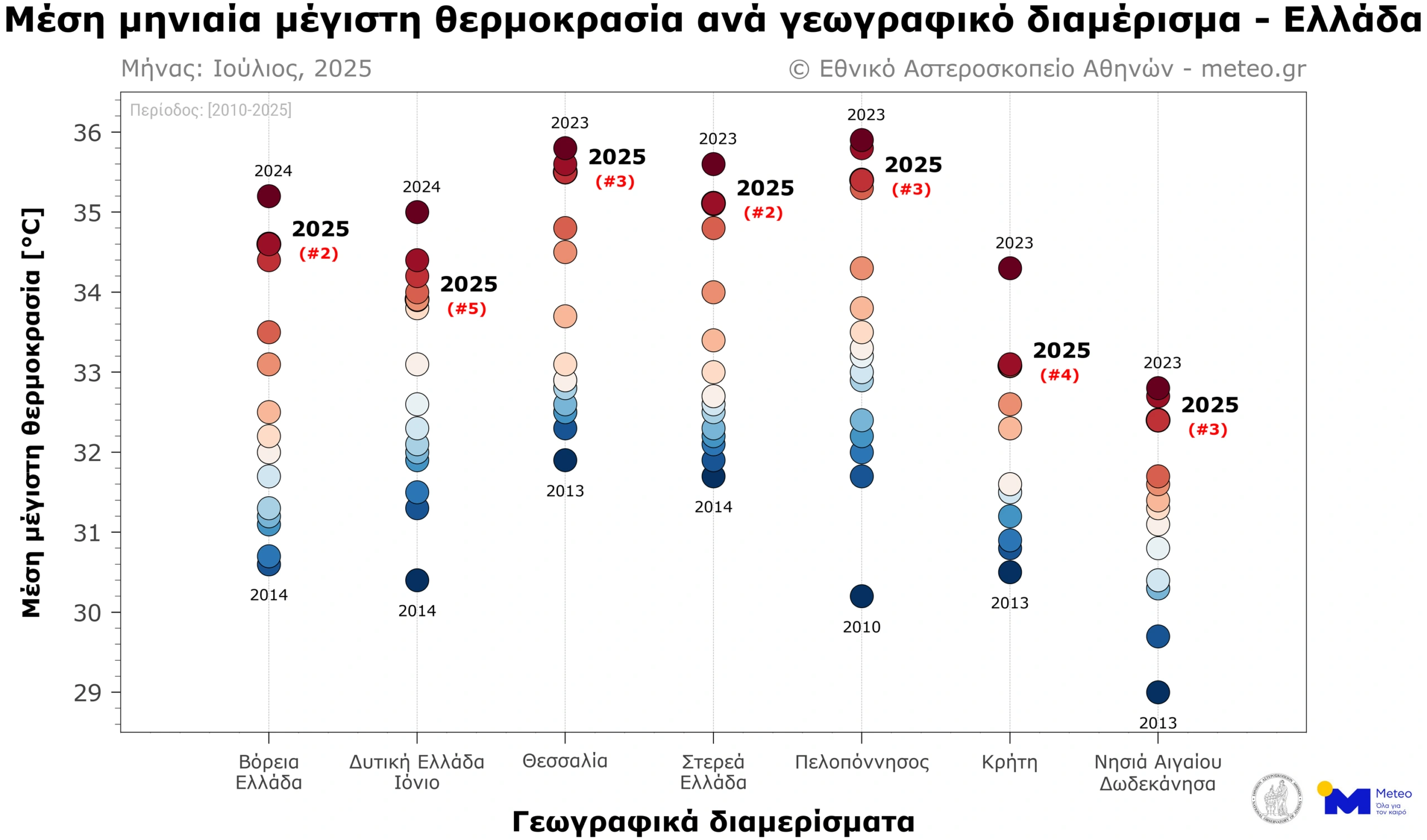 Ειδικότερα, στη Βόρεια και τη Στερεά Ελλάδα, ο Ιούλιος 2025 ήταν ο 2ος θερμότερος από το 2010, στη Θεσσαλία, στην Πελοπόννησο και στα Νησιά Αιγαίου & Δωδεκάνησα ο 3ος θερμότερος, ενώ στην Κρήτη και στη Δυτική Ελλάδα & Ιόνιο ο 4ος και ο 5ος θερμότερος, αντίστοιχα, από το 2010.