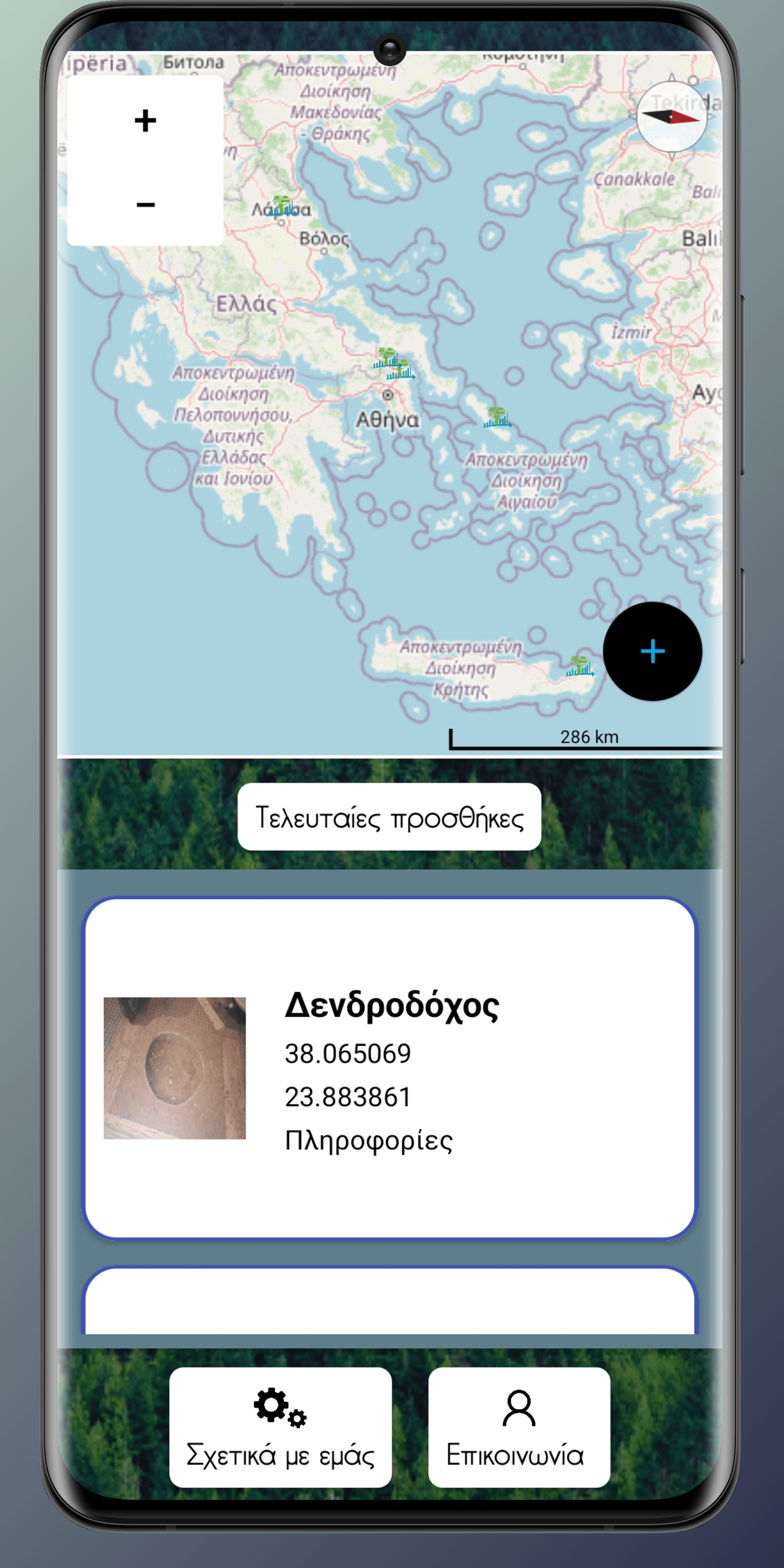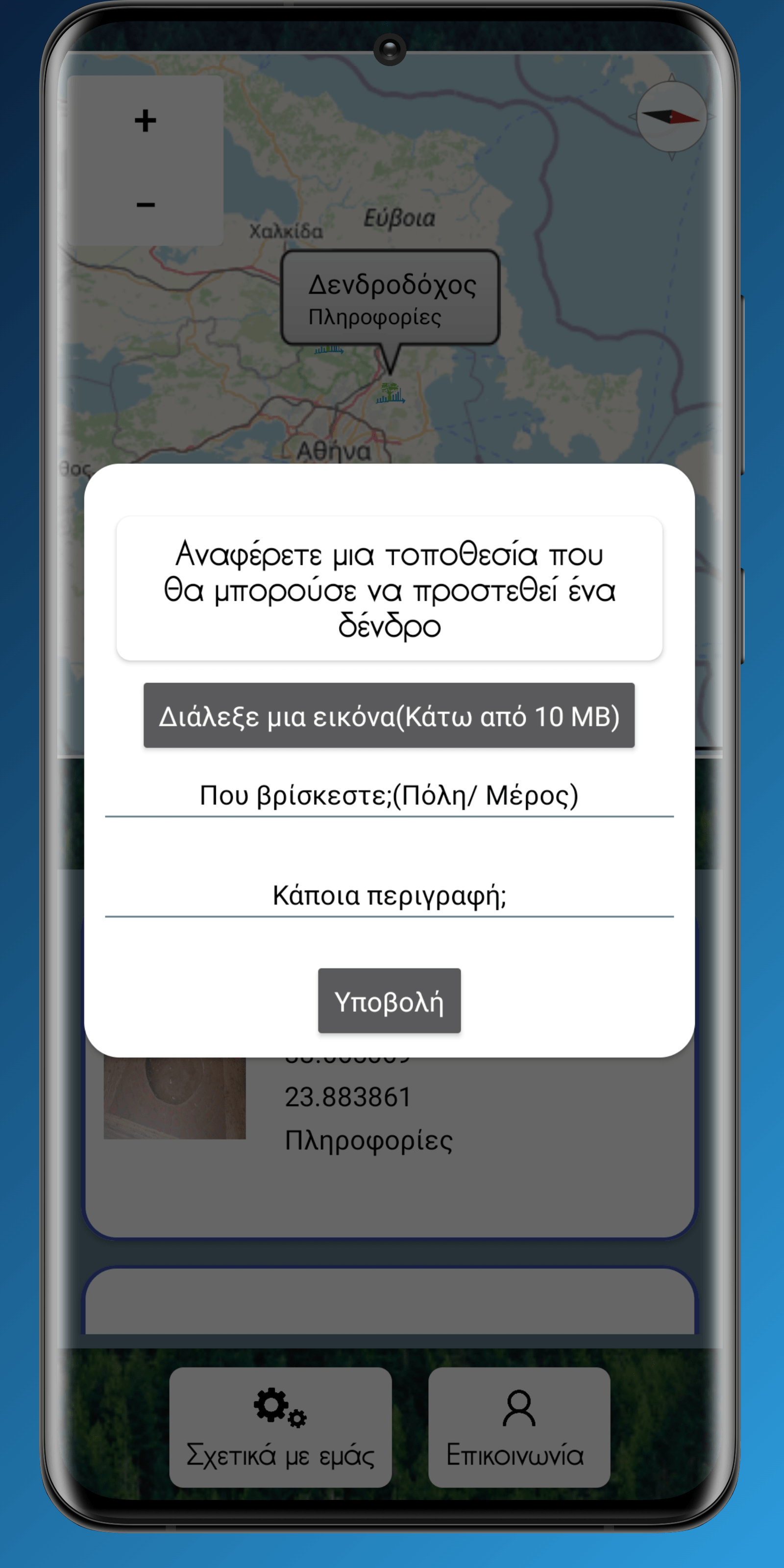 Πιέστε το κουμπί + που βρίσκεται πάνω στον χάρτη όταν θα βρίσκεστε σε κάποιον εξωτερικό χώρο, για να προσθέσετε ένα σημείο που πιστεύεται ότι θα μπορούσε να προστεθεί ένα δενδράκι είτε μια κενή δενδροδόχο μαζί με μια εικόνα από το πιθανό σημείο(μη-υποχρεωτικό). Κατά την διάρκεια αυτής της διαδικασίας, και μόλις πατήσετε υποβολή, μετά από λίγο εμφανίζεται στον χάρτη το σημείο που υποβάλλεται.
