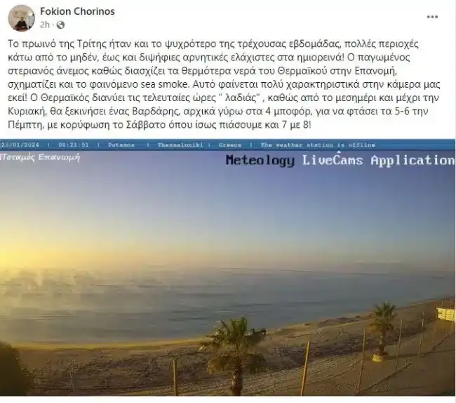 «Ο παγωμένος στεριανός άνεμος, καθώς διασχίζει τα θερμότερα νερά του Θερμαϊκού στην Επανομή, σχηματίζει και το φαινόμενο «sea smoke» αναφέρθηκε στην ίδια ανάρτηση, η οποία συμπληρώθηκε και με μία φωτογραφία.