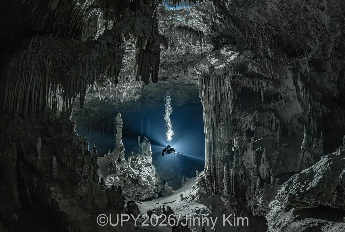 Τρίτος, ανερχόμενος Φωτογράφος της Χρονιάς: Shared Time της Jinny Kim. «Το Heaven’s Gate είναι ένα μαγευτικό τμήμα του υποβρύχιου συστήματος σπηλαίων Nohoch Nah Chich στο Μεξικό. Η εμπειρία της εισόδου σε αυτόν τον χώρο έμοιαζε με μια βαθιά μετατόπιση από το παρόν στο μακρινό παρελθόν. Τα θεμελιώδη στοιχεία συγκλίνουν σε έναν δυναμικό χορό: η φύση και η ανθρωπότητα, το φως και το σκοτάδι, και το εφήμερο ίχνος των αναδυόμενων φυσαλίδων αέρα του δύτη. Στόχος μου ήταν να εκφράσω τα έντονα συναισθήματα και το απόλυτο δέος που με κυρίευσαν σε αυτόν τον αιθέριο χώρο. Είναι μια στιγμή καθαρής, ακατέργαστης σύνδεσης με τα κρυμμένα θαύματα του πλανήτη».