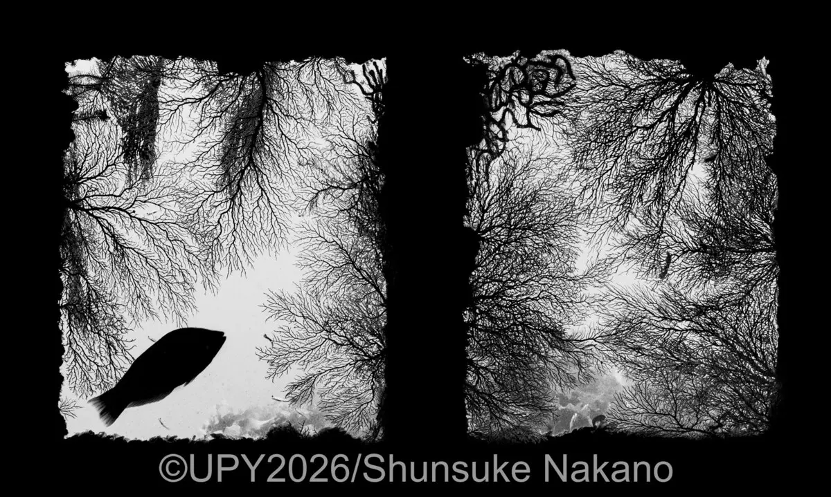 Νικητής, Ασπρόμαυρης φωτογραφίας: Coral Window του Shunsuke Nakano. «Το φως εισέρχεται στο ναυάγιο κοντά στο νησί Sado της Ιαπωνίας, μέσα από ένα παράθυρο, ένα τετράγωνο κομμάτι της ιστορίας που τώρα έχει καταληφθεί από τη ζωή. Επιλέγοντας να φωτογραφίσω σε ασπρόμαυρο, προσκαλώ τον θεατή να αντιπαραβάλει τις παχιές, ευθείες γραμμές που έχει δημιουργήσει ο άνθρωπος με τα λεπτεπίλεπτα και περίπλοκα μοτίβα της φύσης. Οι γοργόνες (θαλάσσιες ανεμώνες) απλώνονται προς τα έξω σαν παγωμένη ανάσα, μετατρέποντας τη σκουριά σε τέχνη. Ανάμεσά τους, ένα μοναχικό ψάρι δίνει έμφαση στο κάδρο. Το παράθυρο δεν κοιτάζει πλέον προς τα έξω, αλλά μας προσκαλεί να κοιτάξουμε προς τα μέσα, πλαισιώνοντας την ιστορία της φύσης που ανακτά το μέταλλο».