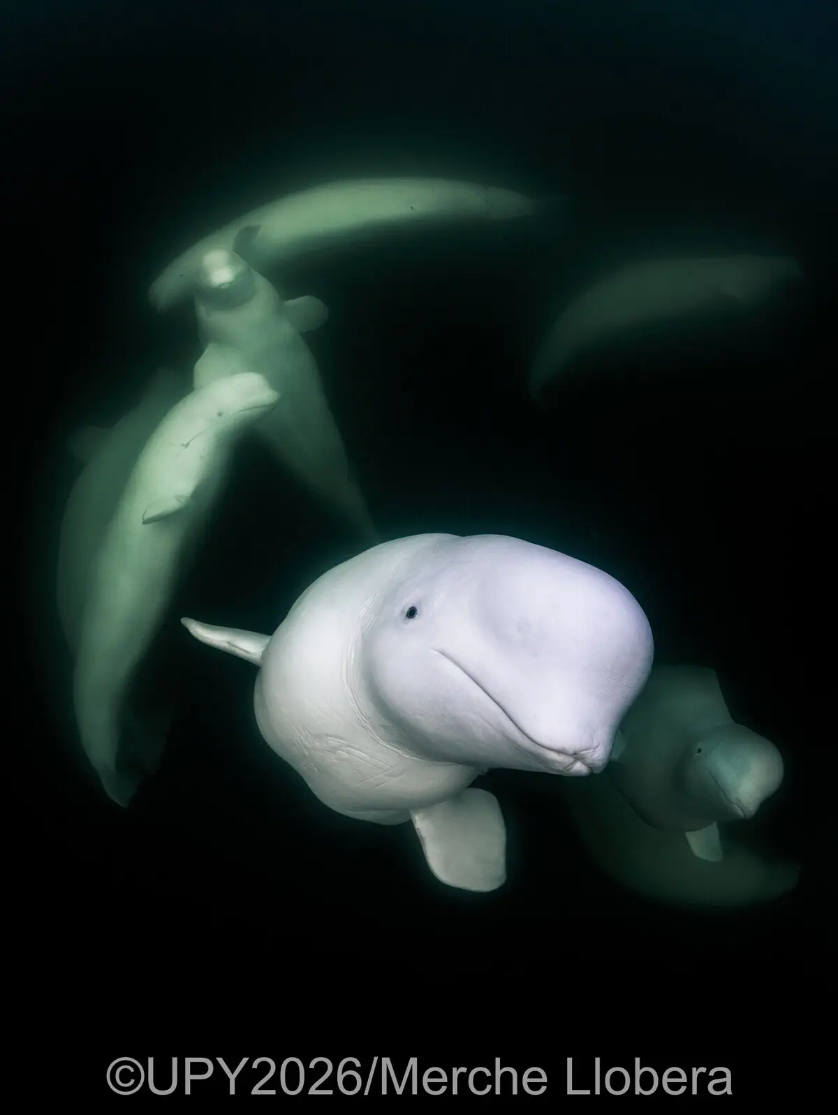 Τρίτο στην κατηγορία πορτρέτο: Λευκά πνεύματα από τη Merche Llobera. «Επιπλέοντας σε μια σανίδα με το κεφάλι και τα χέρια μου βυθισμένα, έζησα μια πραγματικά αξέχαστη εμπειρία. Οι λευκές φάλαινες έρχονταν και έφευγαν ελεύθερα, συναντώντας το βλέμμα μου. Ταξίδεψα στο Τσέρτσιλ του Καναδά, ειδικά για να φωτογραφίσω τις λευκές φάλαινες, αλλά δεν περίμενα ποτέ τόσο στενές, πρόθυμες αλληλεπιδράσεις. Η πρόθεσή μου ήταν απλώς να είμαι εκεί, να απολαύσω τη στιγμή και να δημιουργήσω την καλύτερη δυνατή εικόνα, αφήνοντας πάντα τα ζώα να καθορίζουν το ρυθμό».