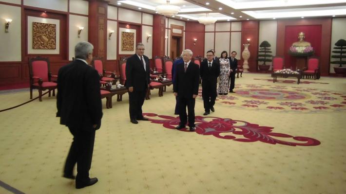 Σύμφωνα με σχετική ενημέρωση από το ΚΚΕ, ο γγ της ΚΕ του ΚΚ Βιετνάμ Nguyen Phu Trong, καλωσορίζοντας την αντιπροσωπεία, τόνισε ότι η επίσκεψή της στη χώρα αποτελεί μια σημαντική ευκαιρία για ανταλλαγή πληροφοριών, καθώς και για συζήτηση των ζητημάτων που απασχολούν τα δύο κόμματα και τους λαούς των δύο χωρών. Όπως σημείωσε, το Βιετνάμ πέρασε μια μεγάλη περίοδο πολέμων, ενώ σήμερα παλεύει για την εθνική οικοδόμηση.