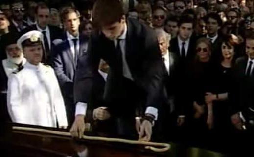 Το άγημα δίπλωσε τη σημαία με την οποία ήταν σκεπασμένο το φέρετρο και την παρέδωσε στον Κυριάκο Μητσοτάκη. Στη συνέχεια πλησίασε ο νεαρός Κωνσταντίνος (που έχει το όνομα του παππού του) και άφησε πάνω στο φέρετρο, πριν την ταφή, άφησε στο φέρετρο την κατσούνα του παππού.